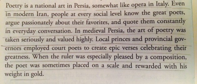 When I first encountered Persian poetry, I marvelled at how wonderful it was. One reason? It has an audience… a culture that celebrates, values — and funds –its expression: